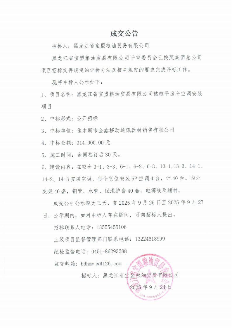 黑龙江省宝盟粮油贸易有限公司储粮平房仓空调安装项目中标公告