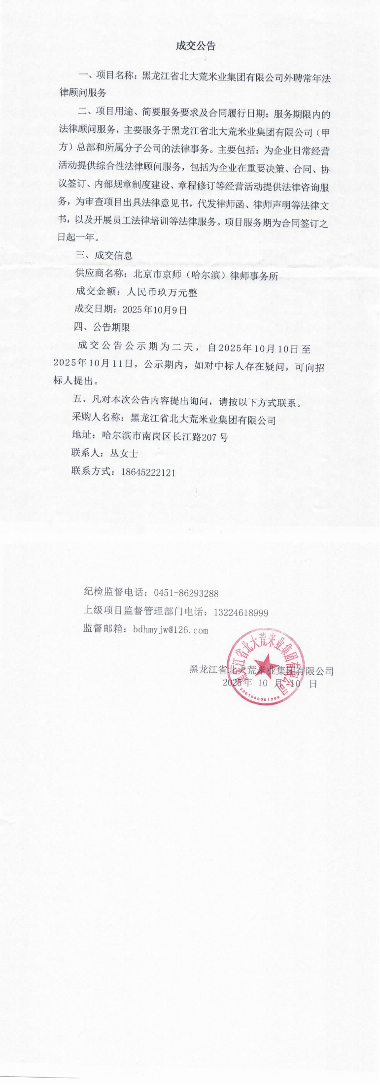 黑龙江省北大荒米业集团有限公司外聘常年法律顾问服务成交公告