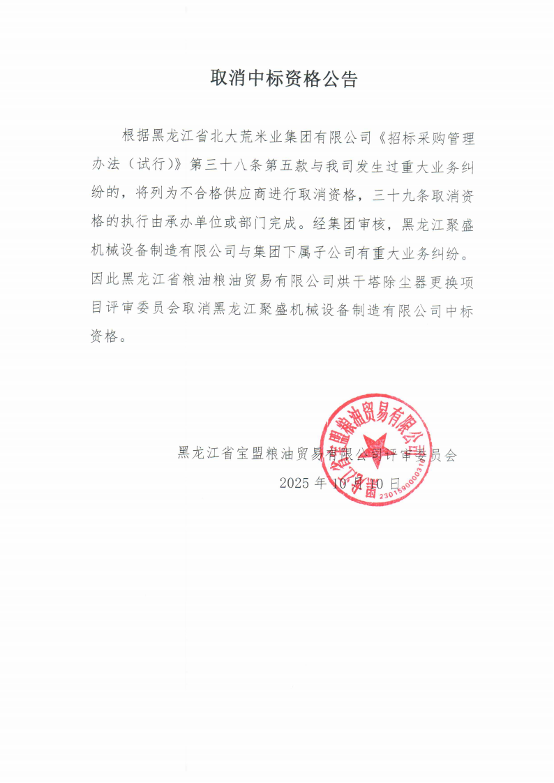 宝盟粮油贸易有限公司关于取消黑龙江聚盛机械设备制造有限公司中标资格的公告