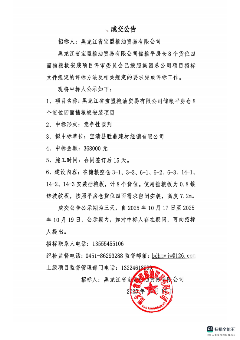 宝盟粮油贸易有限公司储粮平房仓8个货位四面挡粮板安装项目成交公告