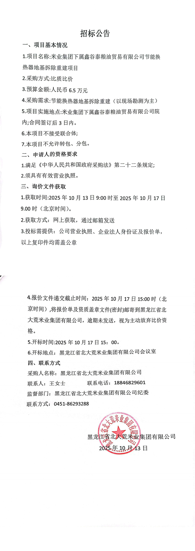 米业集团下属鑫谷泰粮油贸易有限公司节能换热器地基拆除重建项目采购公告