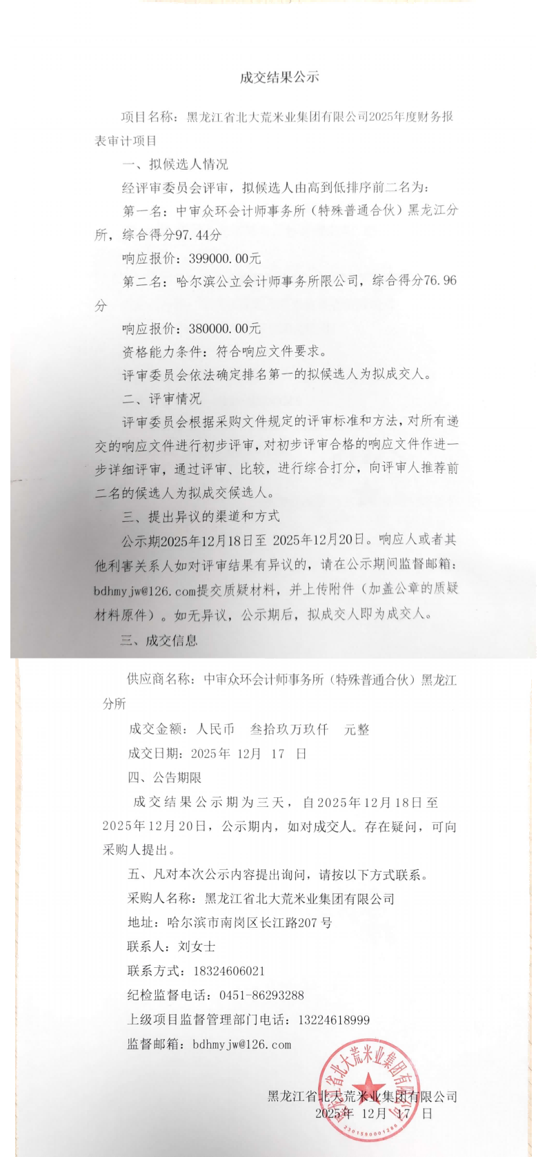 北大荒米业集团有限公司2025年度财务报表审计项目成交公告