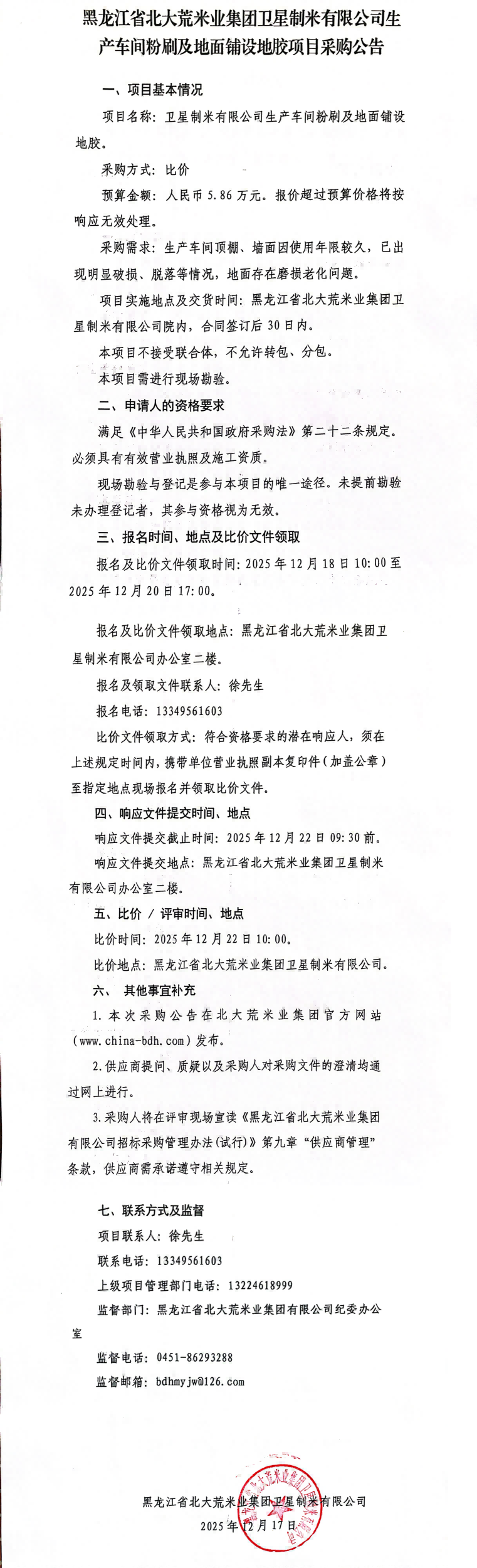 卫星制米有限公司生产车间粉刷及地面铺设地胶项目采购公告