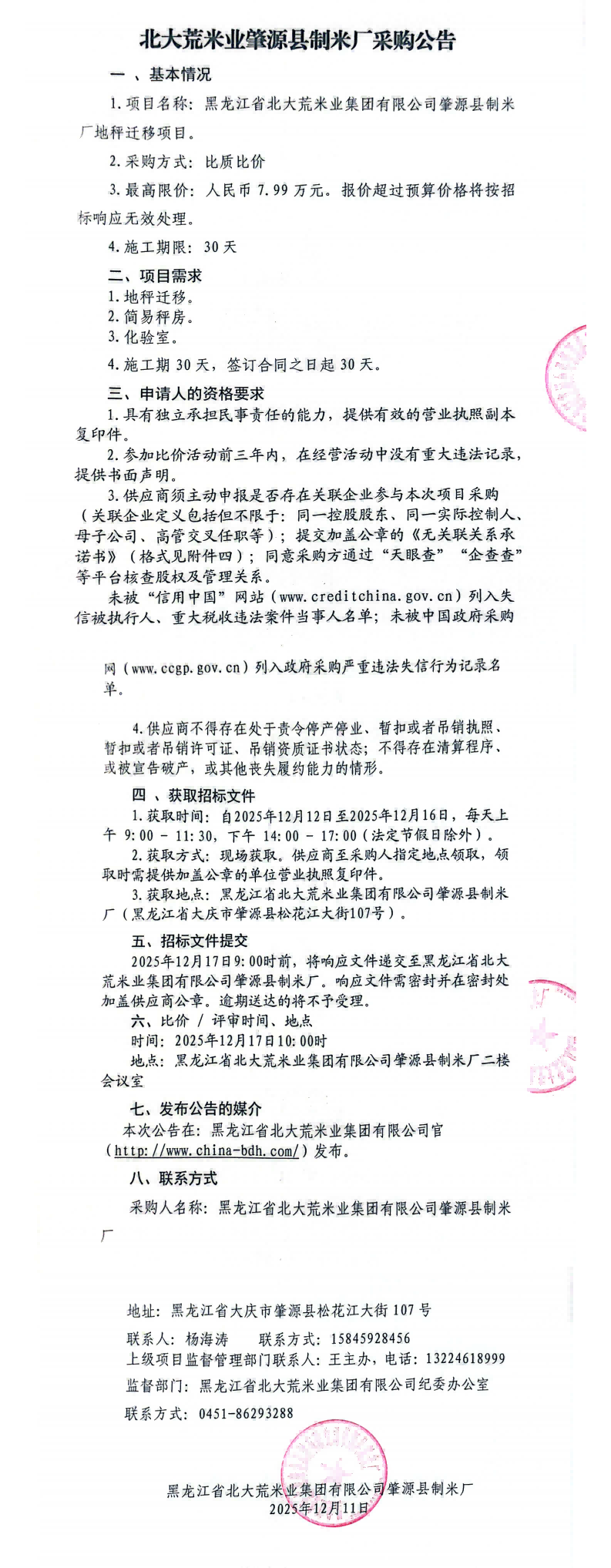 北大荒米业集团肇源县制米厂地秤迁移项目采购公告