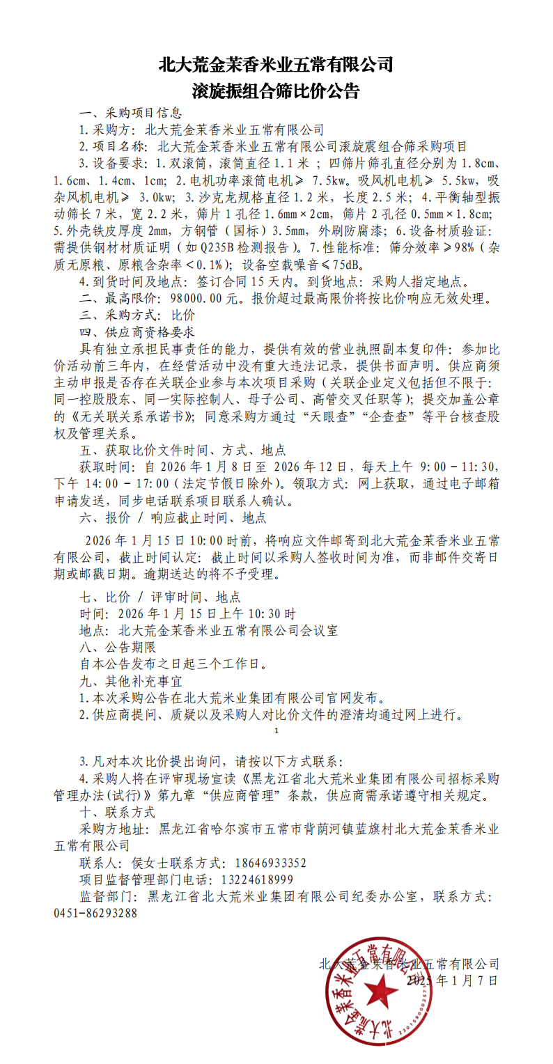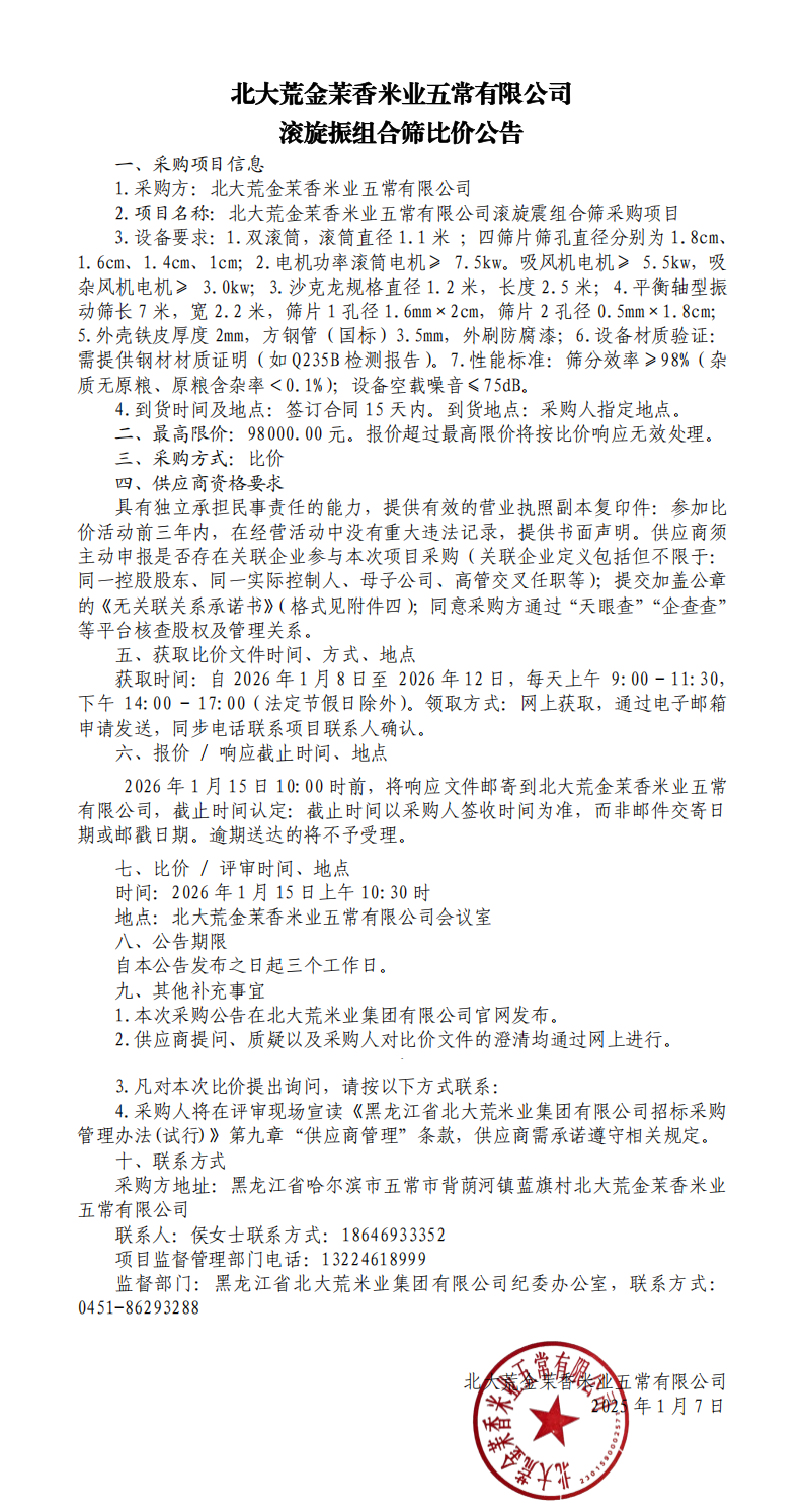 北大荒金茉香米业五常有限公司滚旋震组合筛采购公告