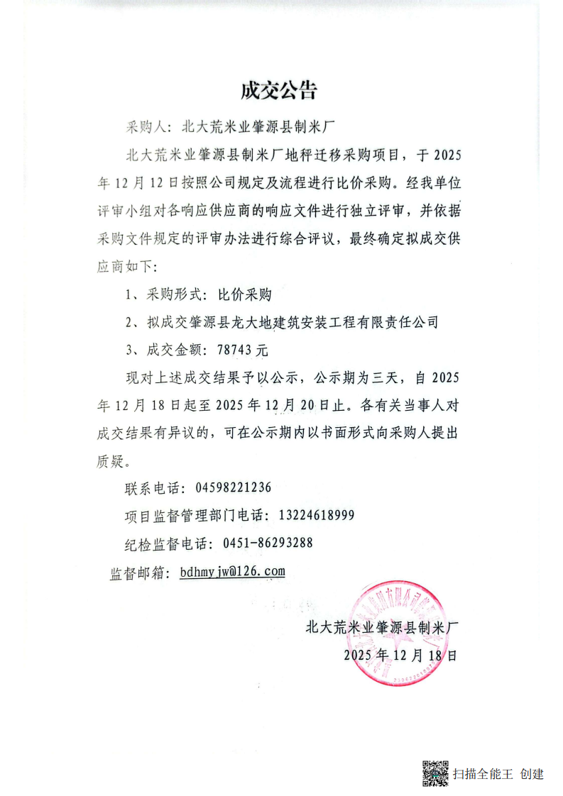 北大荒米业集团肇源县制米厂地秤迁移项目成交公告