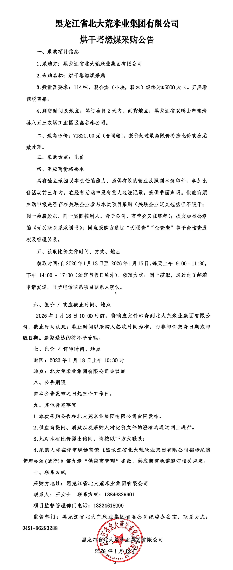 黑龙江省北大荒米业集团有限公司烘干塔燃煤采购公告