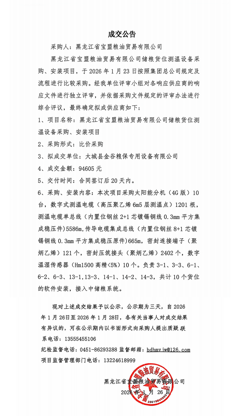 黑龙江省宝盟粮油贸易有限公司储粮货位测温设备采购安装项目成交公告