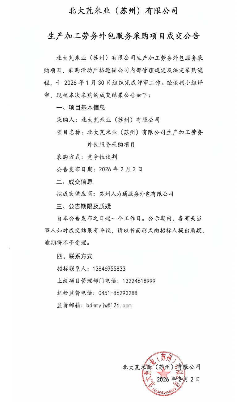 北大荒米业(苏州)有限公司生产加工劳务外包服务采购项目成交公告