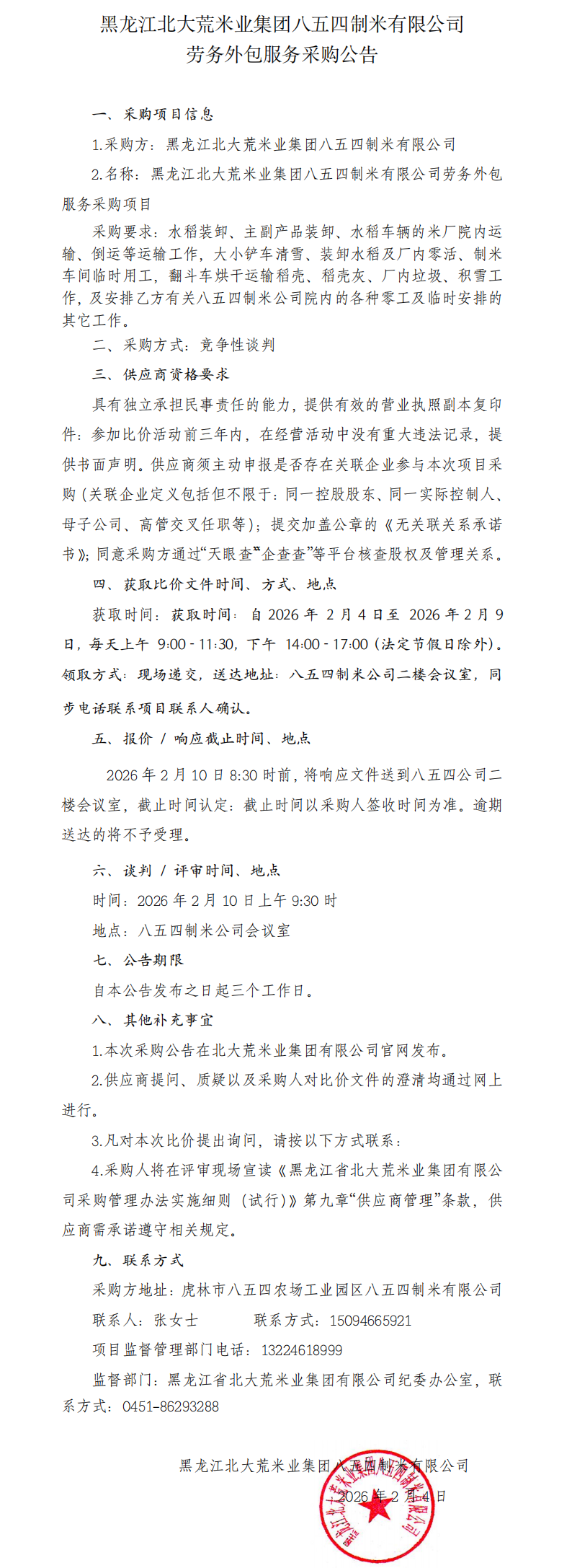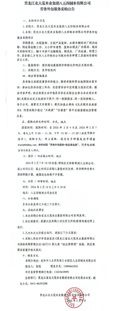 黑龙江北大荒米业集团八五四制米有限公司劳务外包服务采购公告