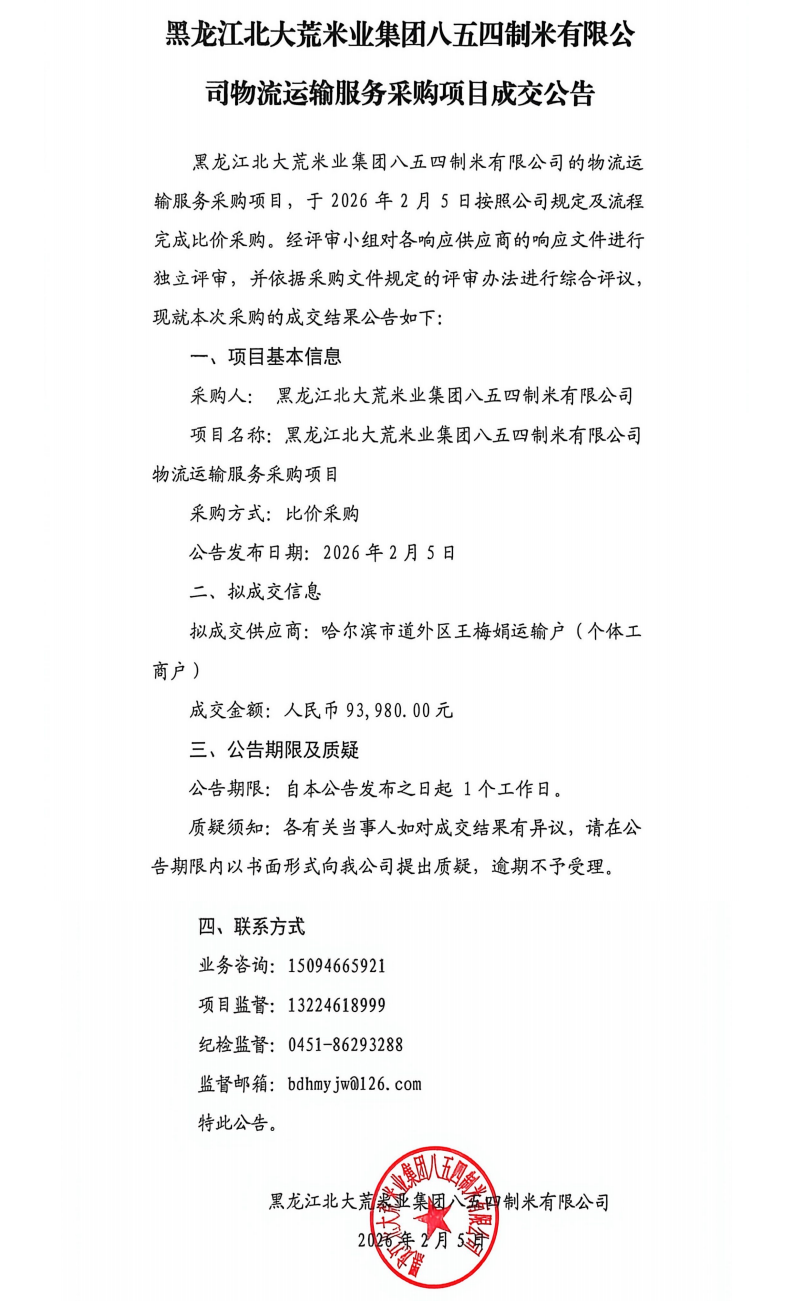 黑龙江北大荒米业集团八五四制米有限公司物流运输服务采购项目成交公告