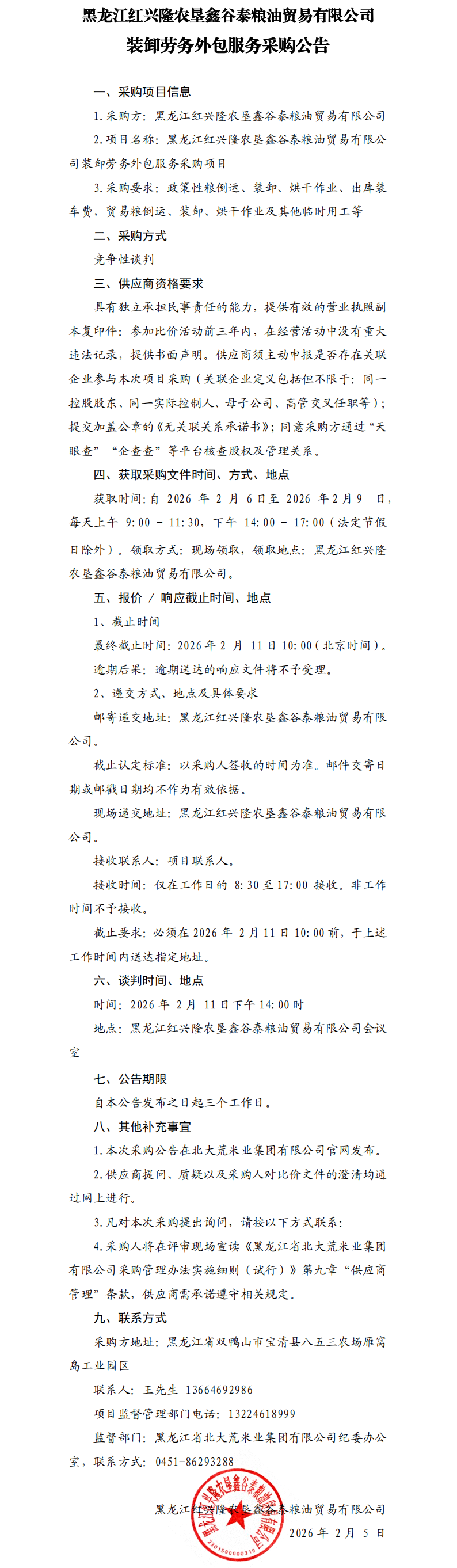 黑龙江红兴隆农垦鑫谷泰粮油贸易有限公司装卸劳务外包服务项目采购公告