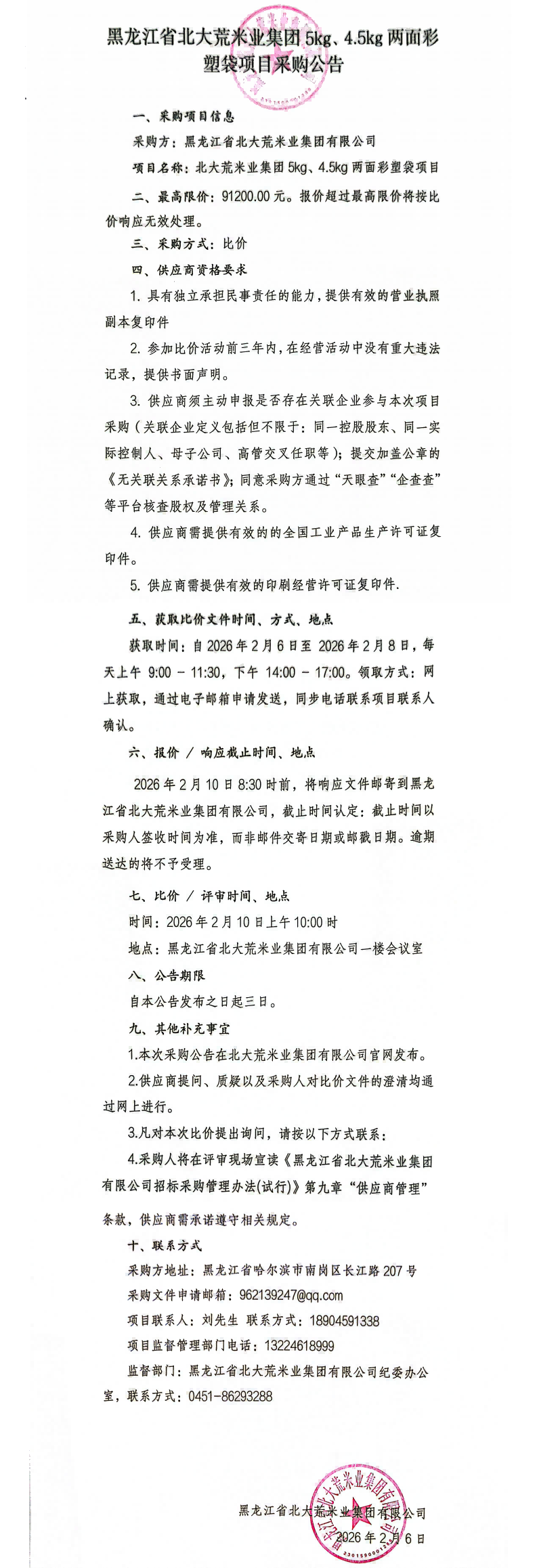 黑龙江省北大荒米业集团5kg、4.5kg两面彩塑袋项目采购公告