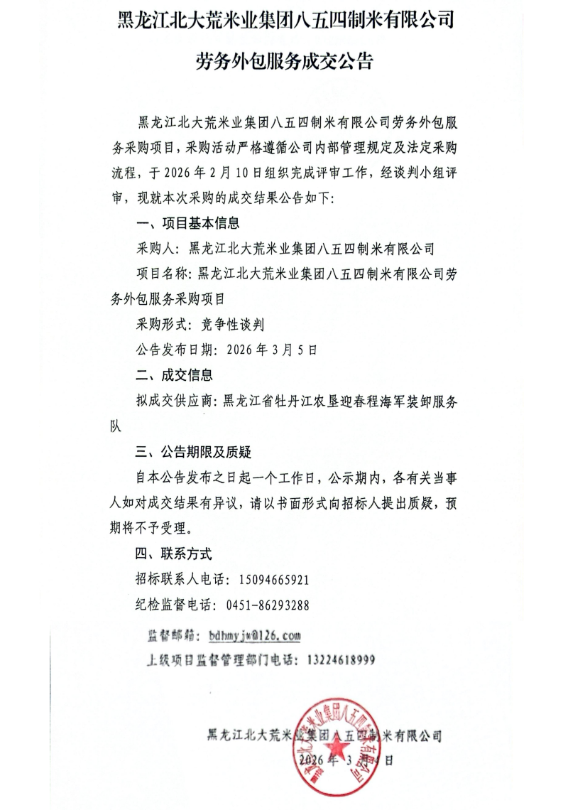 黑龙江北大荒米业集团八五四制米有限公司劳务外包服务成交公告