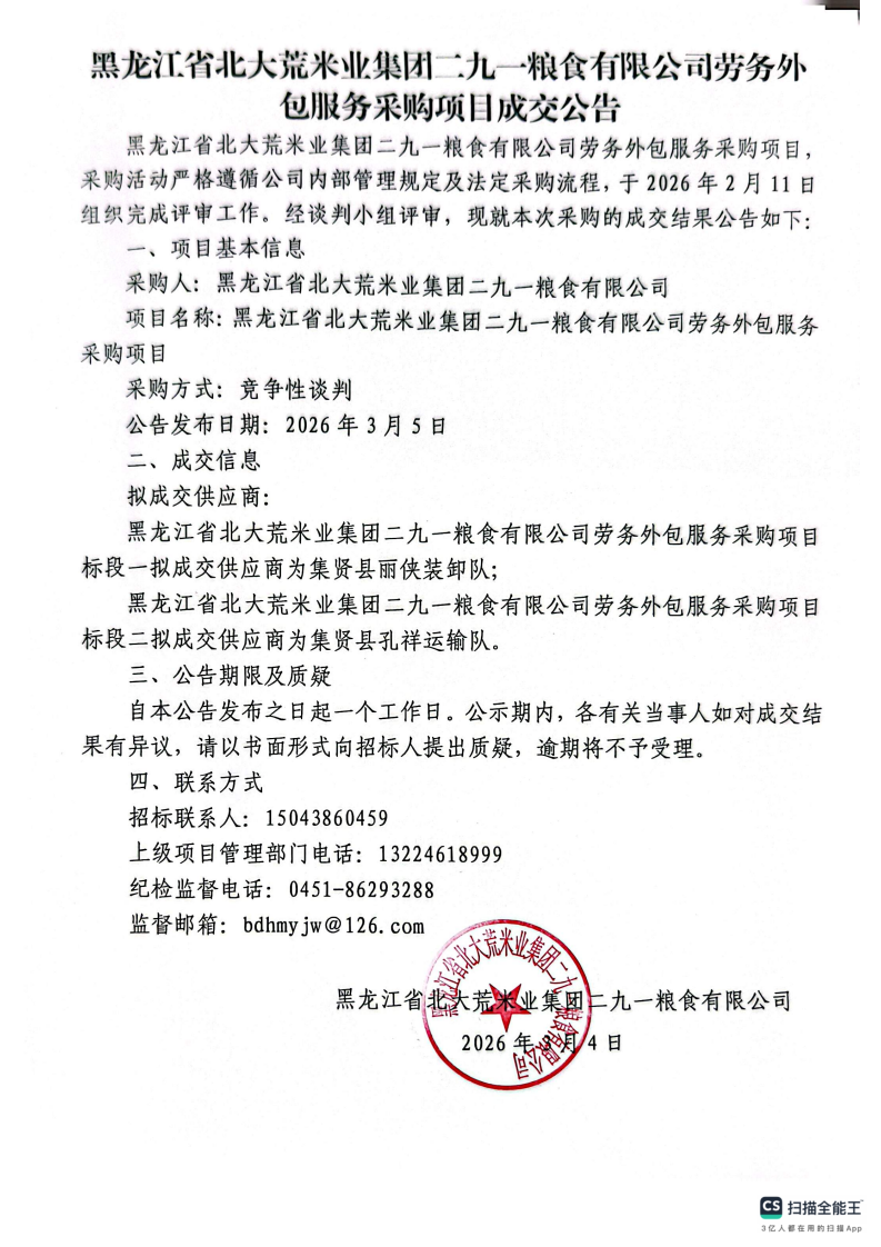 黑龙江省北大荒米业集团二九一粮食有限公司劳务外包服务采购项目成交公告