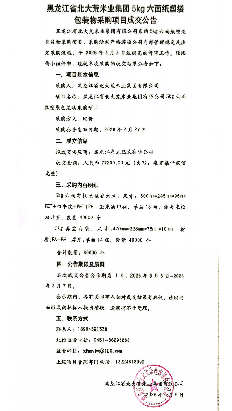 黑龙江省北大荒米业集团5kg六面纸塑袋包装物采购项目成交公告
