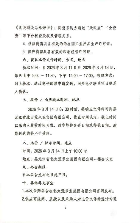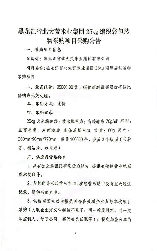 黑龙江省北大荒米业集团25kg编织袋包装物采购公告