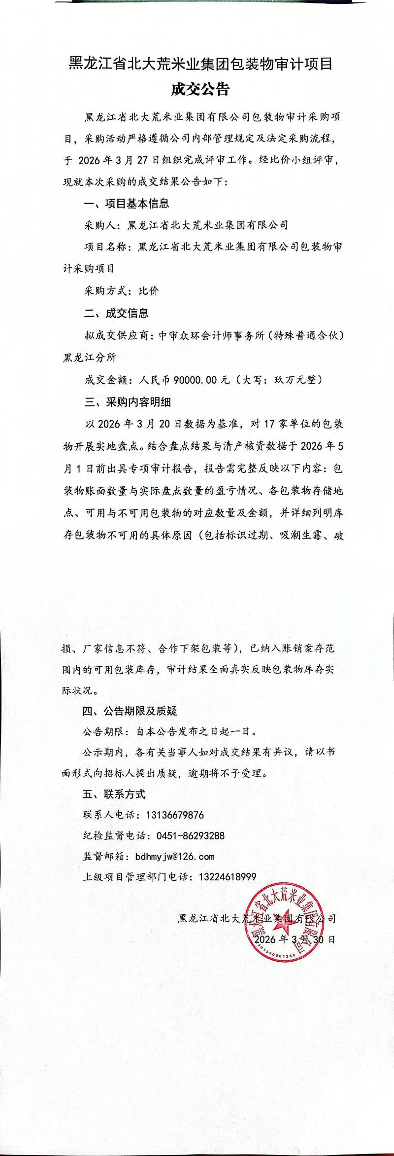 黑龙江省北大荒米业集团有限公司包装物审计项目成交公告