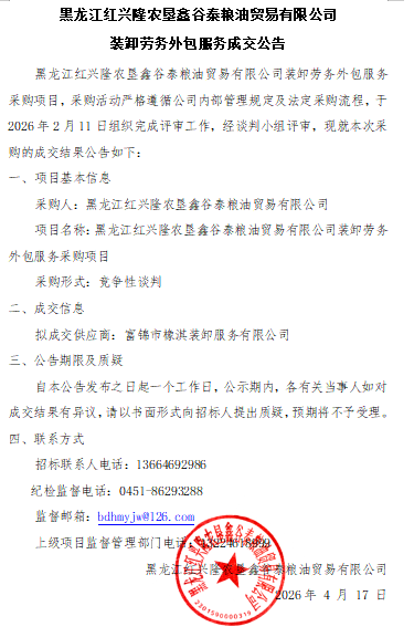 黑龙江红兴隆农垦鑫谷泰粮油贸易有限公司装卸劳务外包服务成交公告